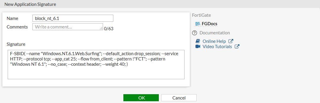 F-SBID( --attack_id 6483; --name "Windows.NT.6.1.Web.Surfing"; --default_action drop_session; --service HTTP; --protocol tcp; --app_cat 25; --flow from_client; --pattern !"FCT"; --pattern "Windows NT 6.1"; --no_case; --context header; --weight 40; )This signature scans HTTP and HTTPS traffic that matches the pattern Windows NT 6.1 in its header. For blocking older versions of Windows, such as Windows XP, you would use the pattern Windows NT 5.1. An attack ID is automatically generated when the signature is created.