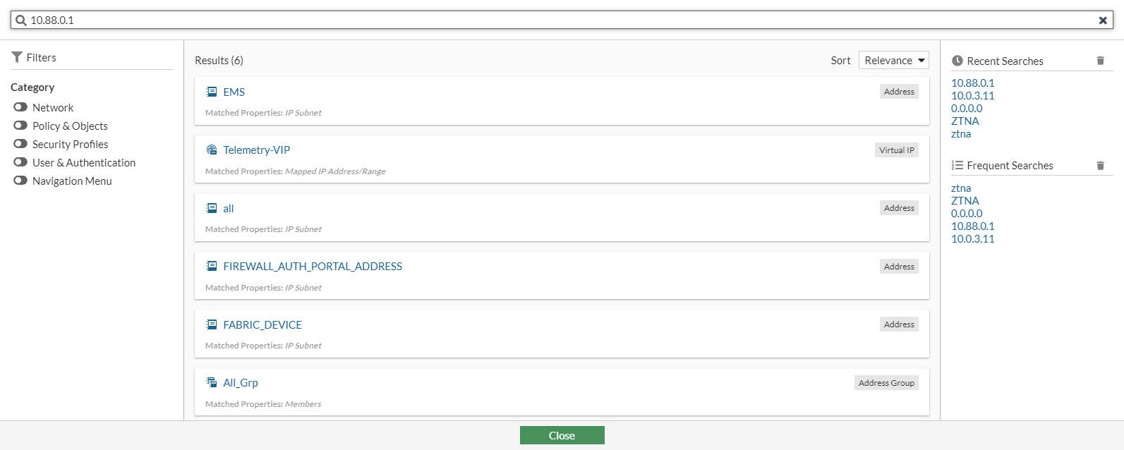 Sorting by Relevance will display address objects that are more closely matched at the top (10.88.0.1), and more loosely matched at the bottom ( 0.0.0.0).