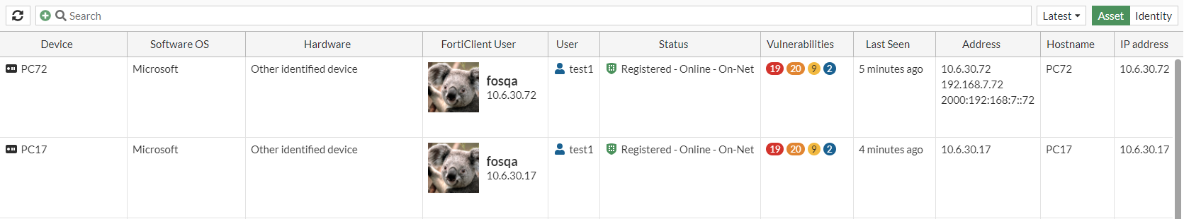 - Click Asset to view information by device. The default columns are Device, Software OS, Hardware, FortiClient User, User, Status, Vulnerabilities, Endpoint Tags, and Last Seen. The optional columns are Address, Firewall Address, Hostname, IP Address, and Server.