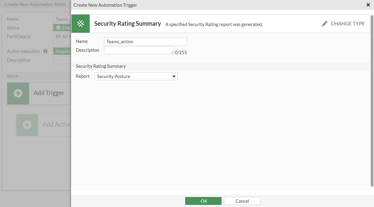 In the following example, you will configure an automation stitch with a Security Rating Summary trigger and two Microsoft Teams Notification actions with different notification messages. One message is for the Security Rating Summary log, and the other is a custom message with a ten second delay.