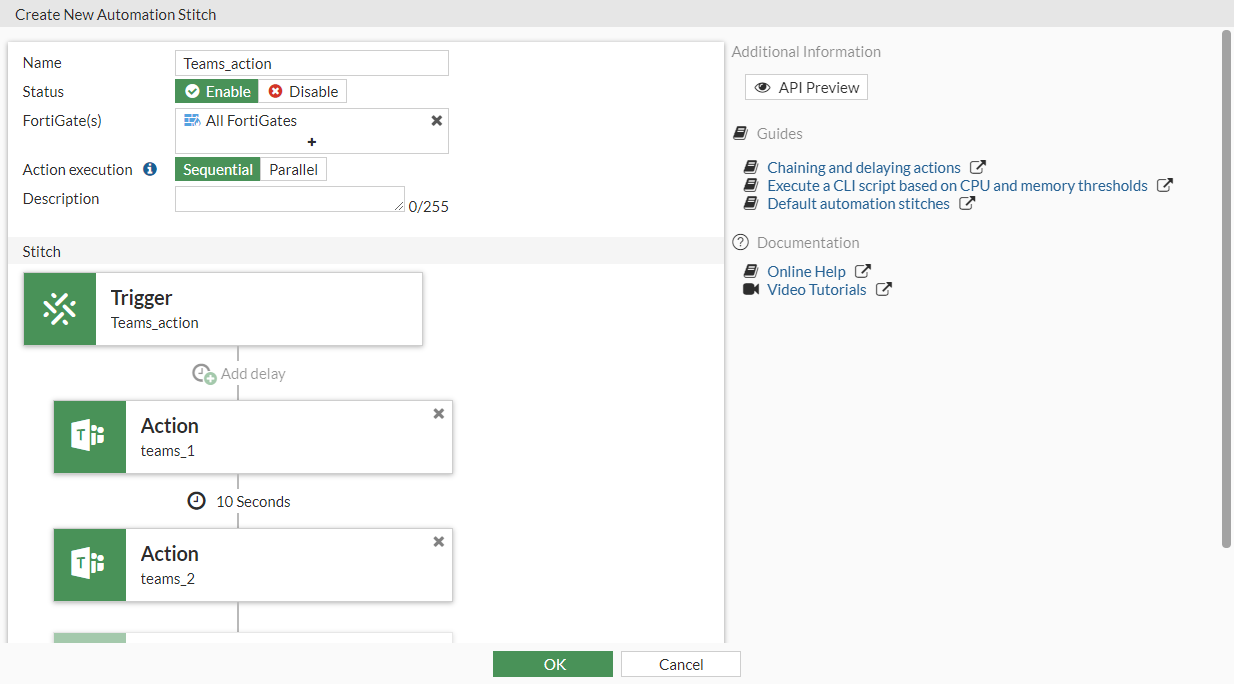 config system automation-action edit "teams_1" set action-type microsoft-teams-notification set uri "outlook.office.com/webhook/xxxxxxxx-xxxx-xxxx-xxxx-xxxxxxxxxxxx@xxxxxxxx-xxxx-xxxx-xxxx-xxxxxxxxxxxx/IncomingWebhook/xxxxxxxxxxxxxxxxxxxxxxxxxxxxxxxx/xxxxxxxx-xxxx-xxxx-xxxx-xxxxxxxxxxxx" next edit "teams_2" set action-type microsoft-teams-notification set message "This is for test." set uri "outlook.office.com/webhook/xxxxxxxx-xxxx-xxxx-xxxx-xxxxxxxxxxxx@xxxxxxxx-xxxx-xxxx-xxxx-xxxxxxxxxxxx/IncomingWebhook/xxxxxxxxxxxxxxxxxxxxxxxxxxxxxxxx/xxxxxxxx-xxxx-xxxx-xxxx-xxxxxxxxxxxx" next end - Configure the automation stitch: