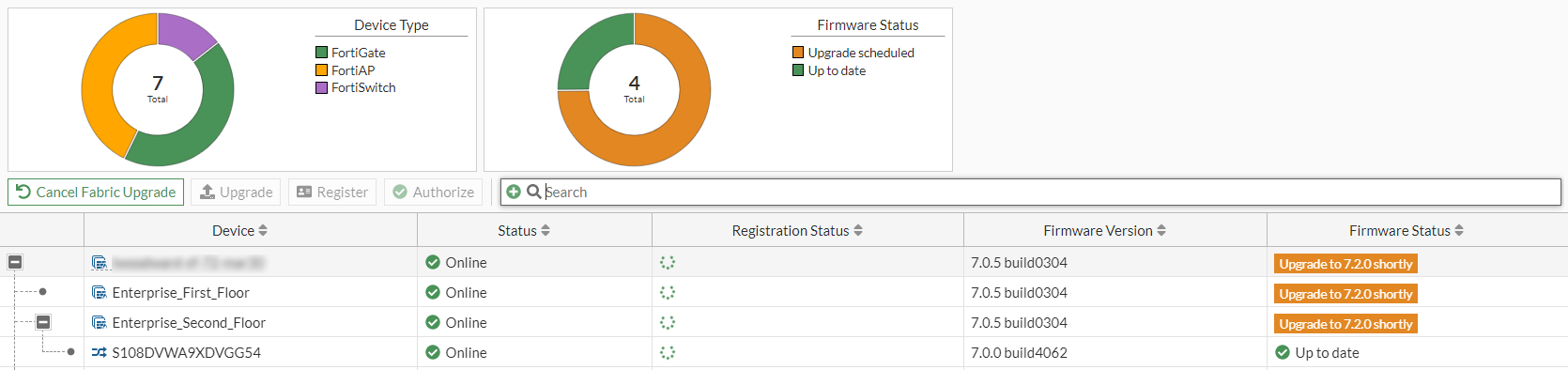 Use the Fabric Upgrade process to select a firmware version from FortiGuard for the FortiGate. When part of a Security Fabric, the select target firmware is for the root FortiGate.