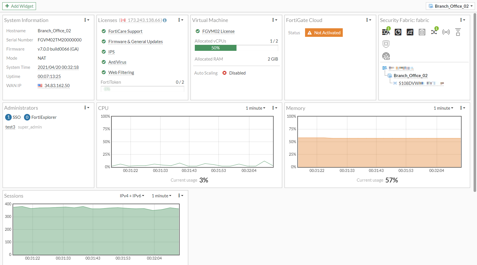 5. While still logged into the root FortiGate IdP in your browser, go to the browser tab for the root FortiGate IdP, and log in to another FortiGate SP that is displayed on the Security Fabric widget in the GUI.