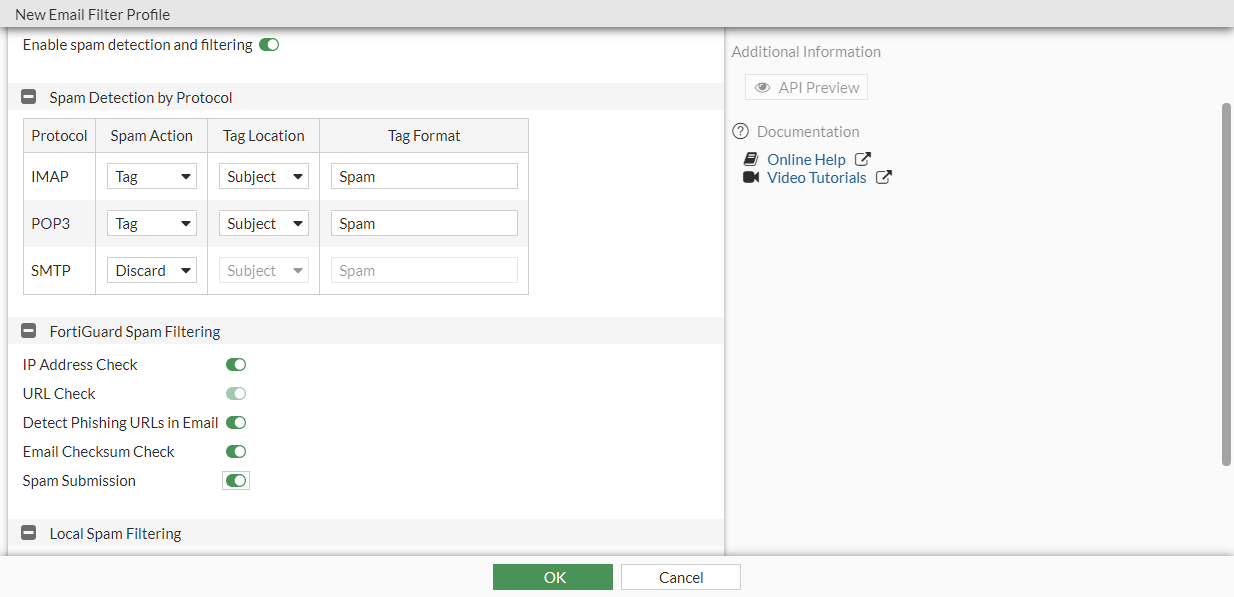 - In the FortiGuard Spam Filtering section, enable the following as needed: