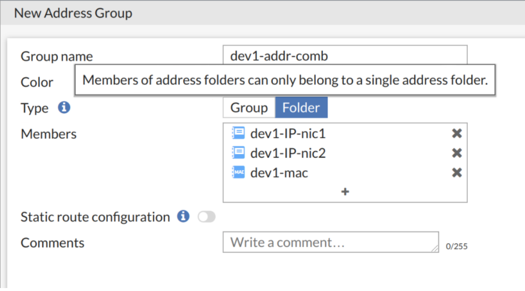 Some address objects logically belong to the same device, such as two IPs from the same computer. These address objects can be grouped into an address folder, which is an exclusive list of address objects that do not appear in other address groups or folders.