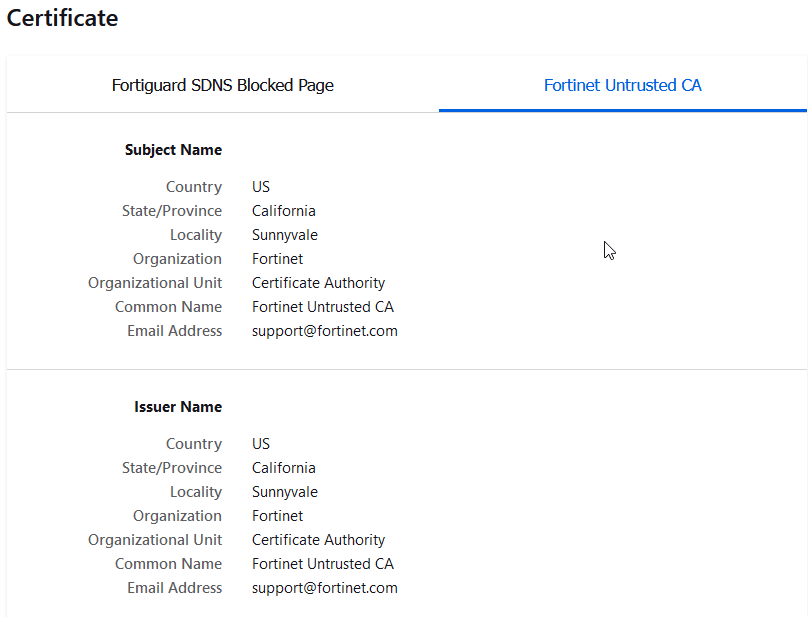 The warning is expected because the blocked page is redirected to the blocked portal on 208.91.112.55, but the page is served in HTTPS using the domain of the destination that the user is trying to reach. Therefore, a Fortinet CA must resign the SSL certificate in order to display the block page content. The Fortinet CA cannot be trusted natively because it is not a publicly trusted CA. As such, when you review the CA issuer, you find that the Common Name of the CA specifically indicates Fortinet Untrusted CA.