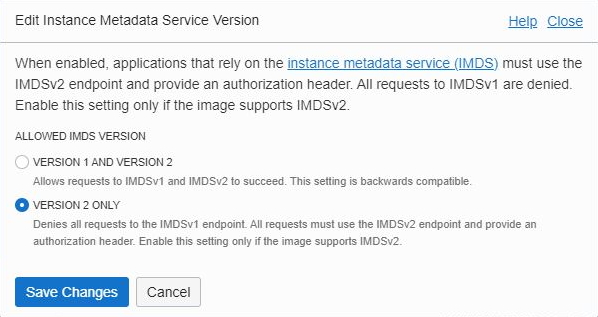 root@mail:/home/oci/scripts# cat metadatav2.json { "areLegacyImdsEndpointsDisabled": true } - While the instance is running, edit the instance metadata service version in the GUI ,and change the allowed IMDS version to VERSION 2 ONLY. See Getting Instance Metadata in the OCI documentation.