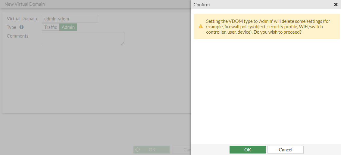 Click OK in the confirmation pane. The administrative VDOM is created.