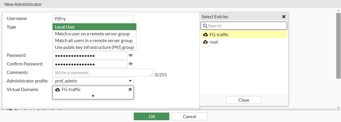 In the Virtual Domains field, add the VDOM that the administrator will be assigned to, and if necessary, remove the other VDOM from the list.