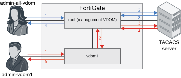 - The FortiGate sends an authorization request to the TACACS server through the management VDOM.