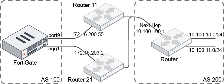 In this example, there are two static routes. The FortiGate has learned two BGP routes from Router 1 that have the same next hop at 10.100.100.1. The next hop is resolved by the two static routes.