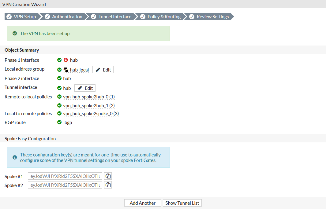 When editing a VPN tunnel, the Hub & Spoke Topology section provides access to the easy configuration keys for the spokes, and allows you to add more spokes.