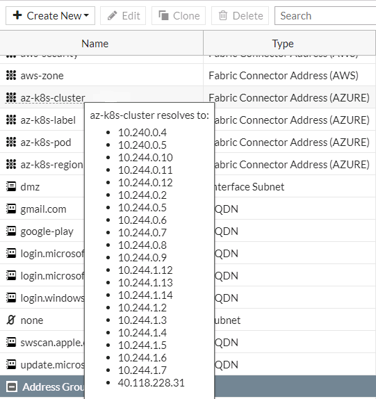 Azure SDN connectors support dynamic address groups based on Azure Kubernetes (AKS) filters.