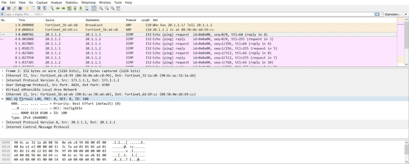 This captures the VXLAN traffic between 172.1.1.1 and 172.1.1.2 with the VLAN 100 tag inside.