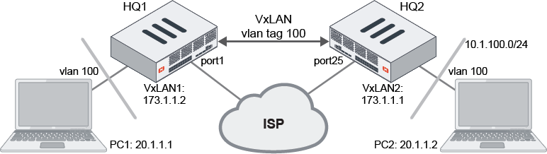 config system interface edit vlan100 set vdom root set vlanid 100 set interface dmz next edit vxlan100 set type vlan set vlanid 100 set vdom root set interface vxlan1 next end - Configure software-switch: