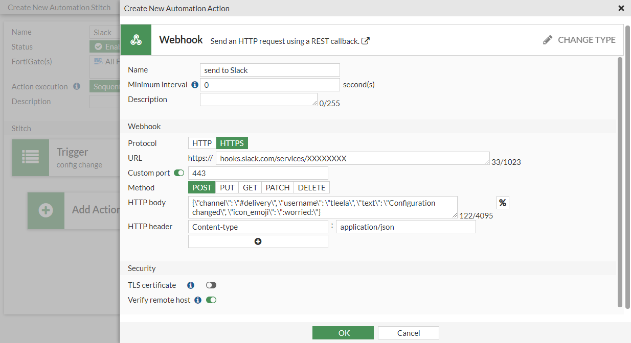 config system automation-action edit "send to Slack" set action-type webhook set protocol https set uri "hooks.slack.com/services/XXXXXXXX" set http-body "{\"channel\": \"#delivery\", \"username\": \"tleela\", \"text\": \"Configuration changed\", \"icon_emoji\": \":worried:\"}" set port 443 config http-headers edit 1 set key "Content-type" set value "application/json" next end next end - Create the automation stitch:
