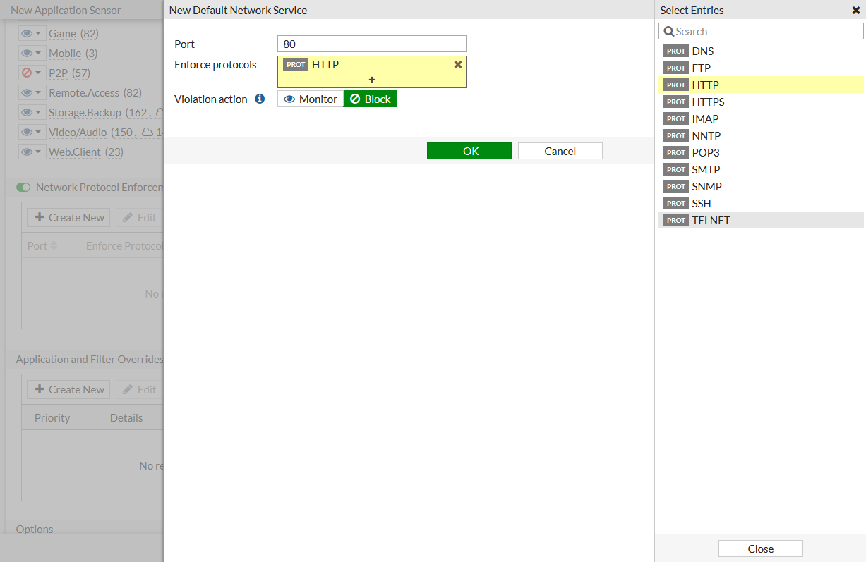 In the following example, an application sensor is configured to enforce HTTP on port 80 (block), and DNS on port 53 (monitor).