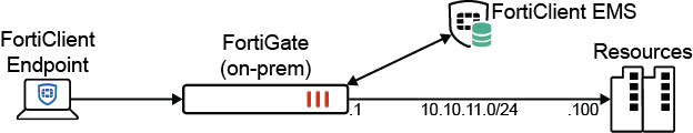 In this topology, FortiClient endpoints use an SSL encrypted connection to the FortiGate access proxy to access protected resources. FortiGate works with FortiClient EMS to use a combination of IP/MAC addresses and ZTNA tags to control FortiClient endpoint access to resources.