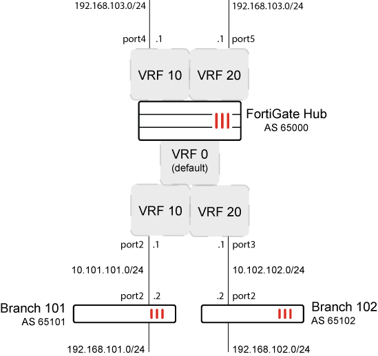 route-mapinside hub's BGP configuration (that is, inside theconfig networkcommand) to selectively advertise a prefix 192.168.103.0/24 to BGP peers that belong to VRF 10 (that is, Branch 101):config router bgp set as 65000 config neighbor edit "10.101.101.2" set soft-reconfiguration enable set interface "port4" set remote-as 65101 set update-source "port4" next edit "10.102.102.2" set soft-reconfiguration enable set interface "port3" set remote-as 65102 set update-source "port3" next end config network edit 1 set prefix 192.168.103.0 255.255.255.0 set route-map "VRF_10" next end end