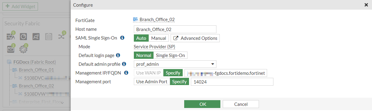 - Go to Security Fabric > Fabric Connectors and double-click the Security Fabric Setup card.