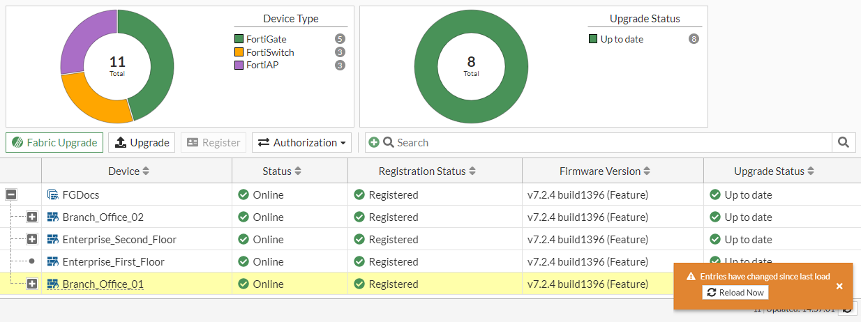 With the WebSocket for Security Fabric events, subscribers to the WebSocket (such as the Fabric Management page) are updated upon new Fabric events and alert users to reload the page.