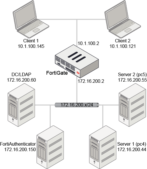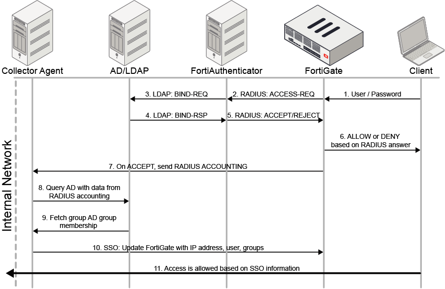 In this example, FortiAuthenticator is used as a RADIUS server. It uses a remote AD/LDAP server for authentication, then returns the authentication results to the FortiGate. This allows the client to have a dynamic IP address after successful authentication.