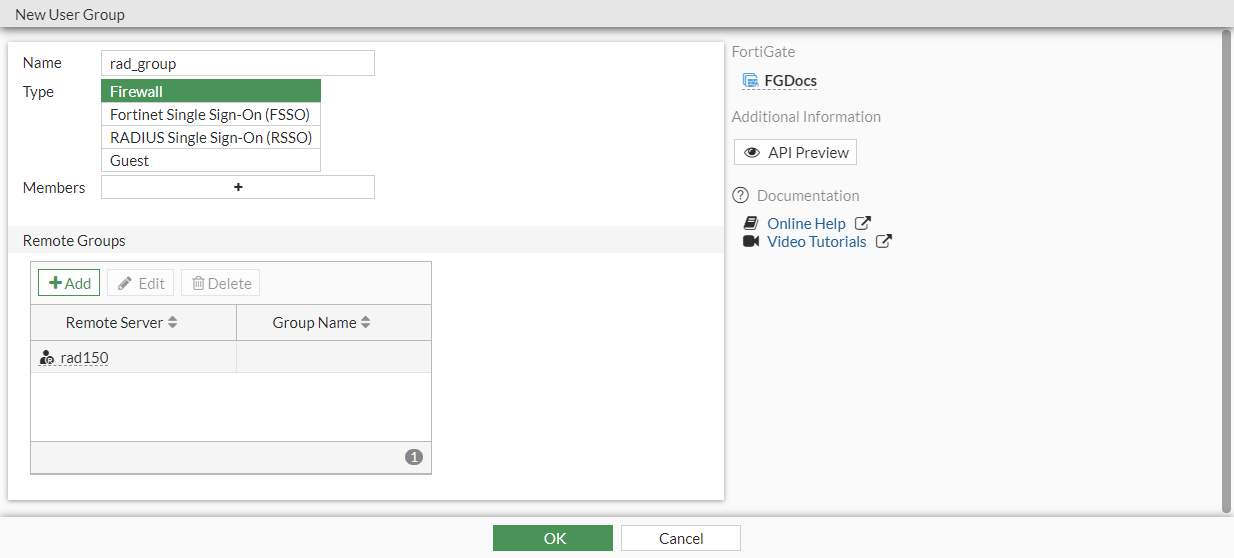 config user radius edit "rad150" set server "172.16.200.150" set secret 123456 set acct-interim-interval 600 config accounting-server edit 1 set status enable set server "172.16.200.60" set secret 123456 next end next end - Create a user group for the RADIUS server: