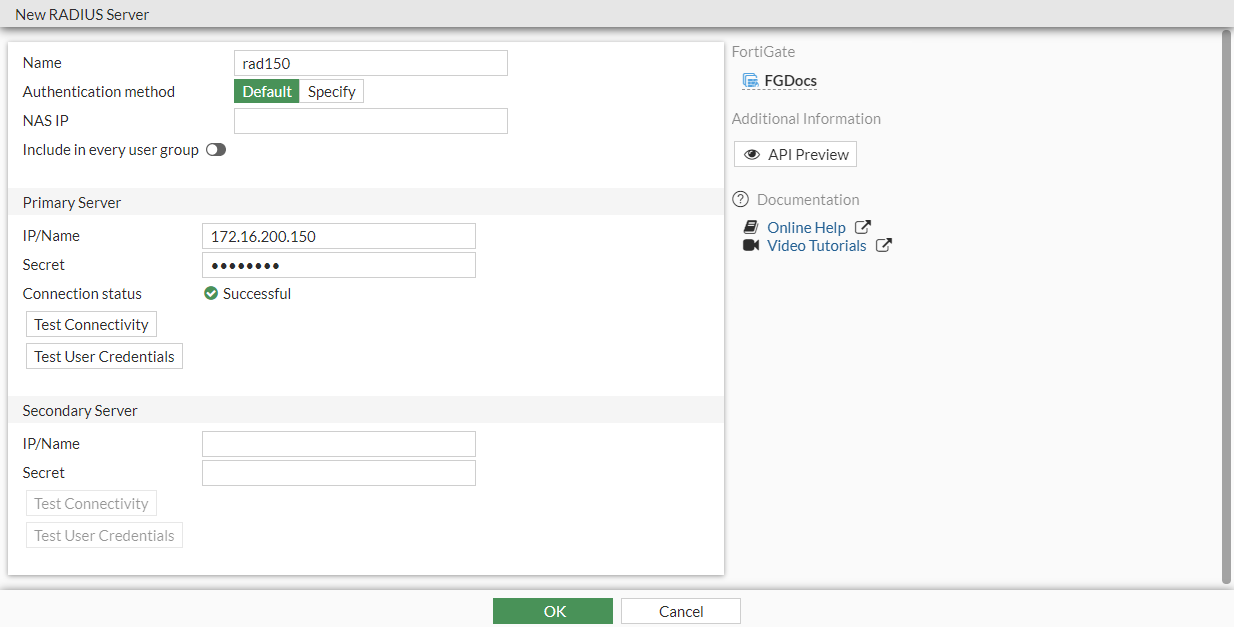 config user radius edit rad150 set acct-interim-interval 600 config accounting-server edit 1 set status enable set server 172.16.200.60 set secret ********* next end next end
