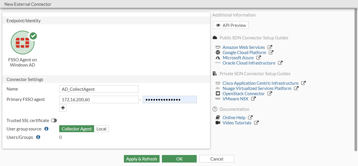 - Create a Fortinet Single Sign-On Agent fabric connector: