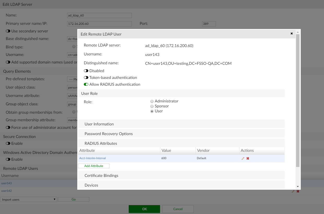 - Edit each user to confirm that they have the RADIUS attribute Acct-Interim-Interval. This attribute is used by FortiGate to send interim update account messages to the RADIUS server.