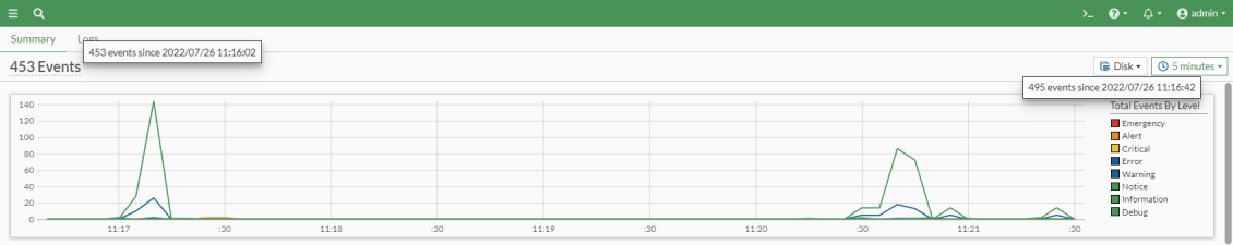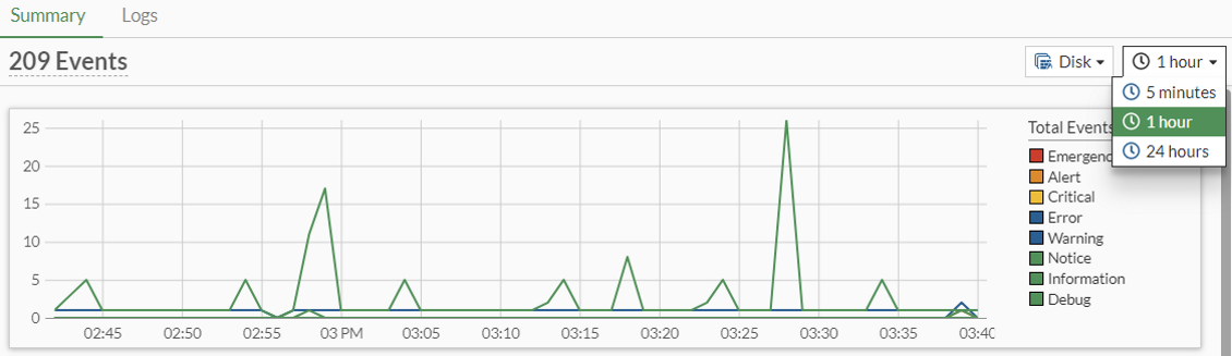 A Summary tab that displays the top five most frequent events in each type of event log and a line chart to show aggregated events by each severity level. Clicking on a peak in the line chart will display the specific event count for the selected severity level.