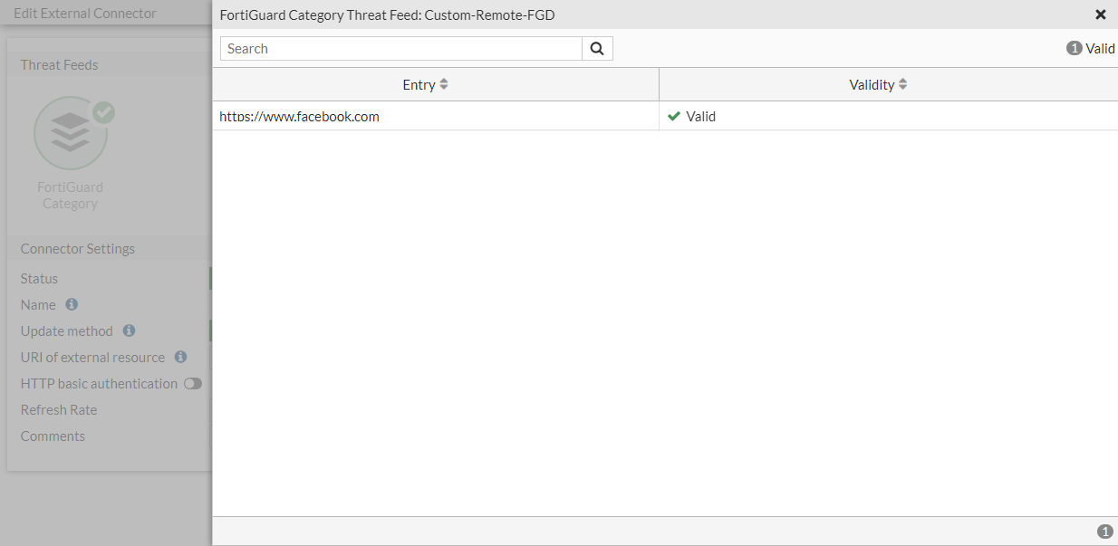 In this example, a list of URLs is imported using the FortiGuard category threat feed. The newly created threat feed is set to block in the web filter profile, and the web filter profile is applied to a firewall policy. Any traffic that passes through the FortiGate and matches the URLs in the threat feed list will be dropped.