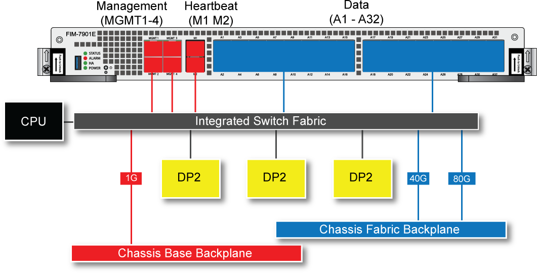 The FIM-7901E includes an integrated switch fabric (ISF) that connects the FIM module front panel interfaces to the DP2 session-aware load balancers and to the chassis fabric and base backplanes. The ISF also allows the DP2 processors to distribute sessions among all NP6 processors on the FortiGate Processor Modules (FPM) in the FortiGate-7000E chassis.