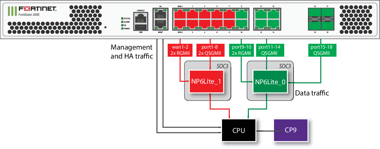 The FortiGate 200E and 201E include two SOC3 NP6Lite processors. The SOC3 CPUs and CP9Lite processors are not used. Instead, the FortiGate 200E and 201E architecture includes separate CPU resources and a standard CP9 processor.