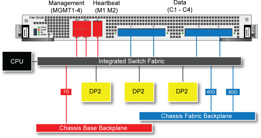 The FIM-7910E includes an integrated switch fabric (ISF) that connects the front panel interfaces to the DP2 session-aware load balancers and to the chassis backplanes. The ISF also allows the DP2 processors to distribute sessions among all NP6 processors on the FortiGate Processor Modules (FPM) in the FortiGate-7000E chassis.