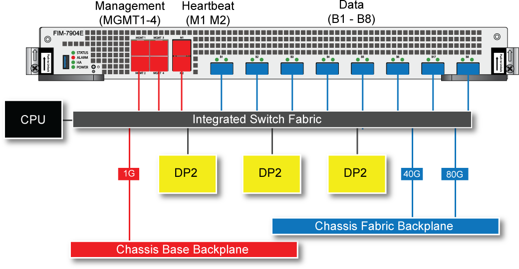 The FIM-7904E includes an integrated switch fabric (ISF) that connects the front panel interfaces to the DP2 session-aware load balancers and to the chassis backplanes. The ISF also allows the DP2 processors to distribute sessions among all NP6 processors on the FortiGate Processor Modules (FPM) in the FortiGate-7000E chassis.