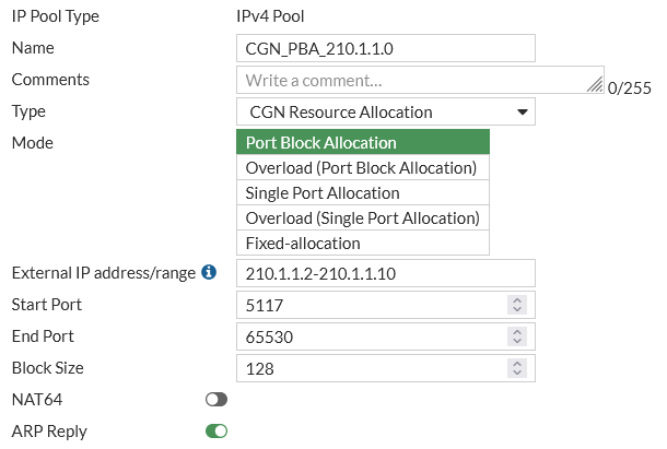 cgn-block-size). The number of ports allocated in a block. The block size can be from 64 to 4096 in increments of 64 (for example, 64, 128, 192,..., 4096). The default value is 128. Use a smaller port block size to conserve available ports. - Enable or disable ARP reply (