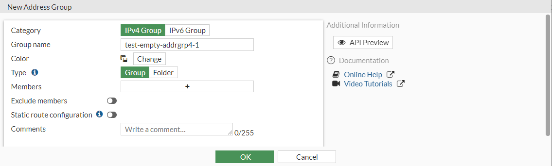 Address groups with no members can be configured in the GUI, CLI, and through the API. In previous versions of FortiOS, error messages appear for empty address groups and they cannot be configured.