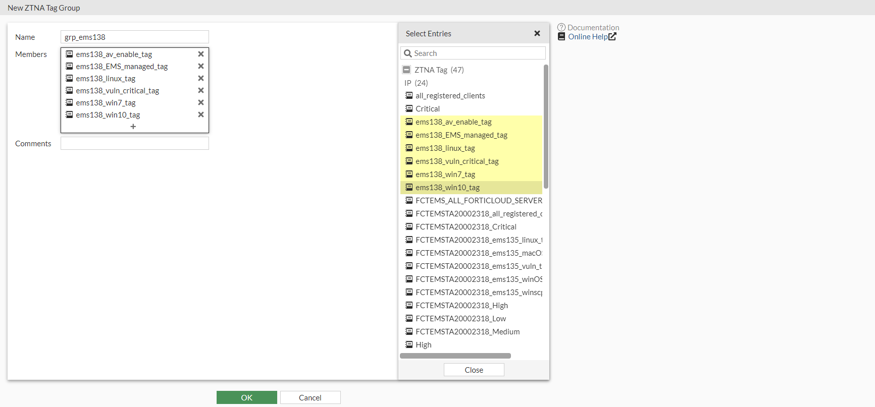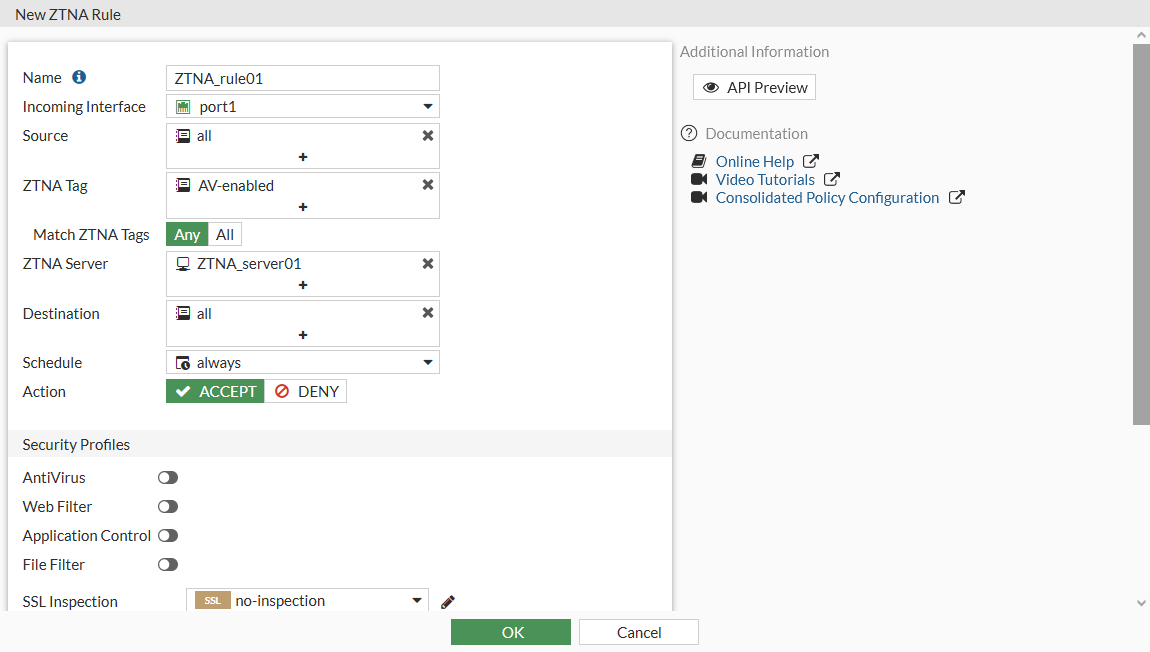 Add the ZTNA tags or tag groups that are allowed access. If multiple tags are included, select the Match ZTNA Tags method, Any or All.