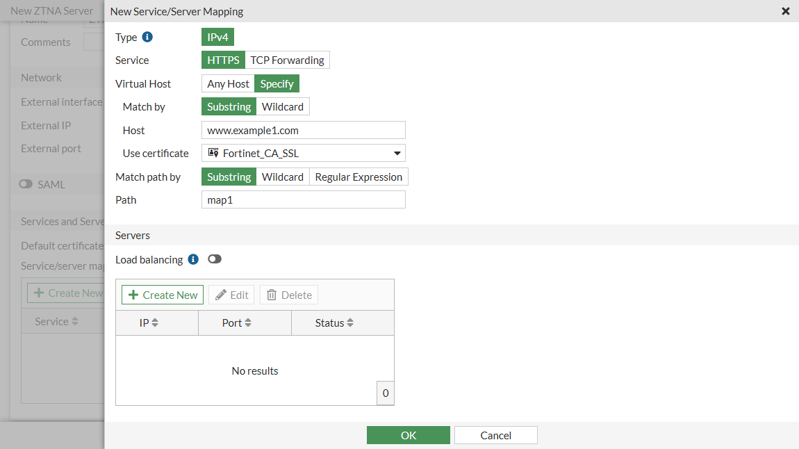 To configure a ZTNA server, define the access proxy VIP and the real servers that clients will connect to. The access proxy VIP is the FortiGate ZTNA gateway that clients make HTTPS connections to. The service/server mappings define the virtual host matching rules and the real server mappings of the HTTPS requests.