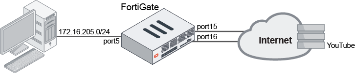 In this example, the FortiGate is configured to load-balance between two WAN interfaces, port15 and port16. A health check is configured in passive mode, and SLA thresholds are set. Passive WAN health measurement is enabled on the SD-WAN policy.