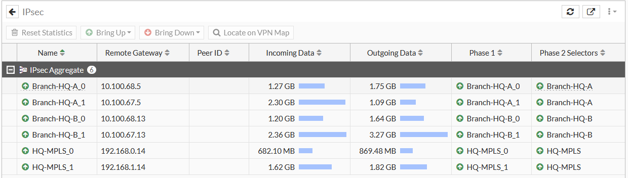 The IPsec monitor displays all connected Site to Site VPN, Dial-up VPNs, and ADVPN shortcut tunnel information. You can use the monitor to bring a phase 2 tunnel up or down or disconnect dial-up users. A notification appears in the monitor when users have not enabled two-factor authentication.