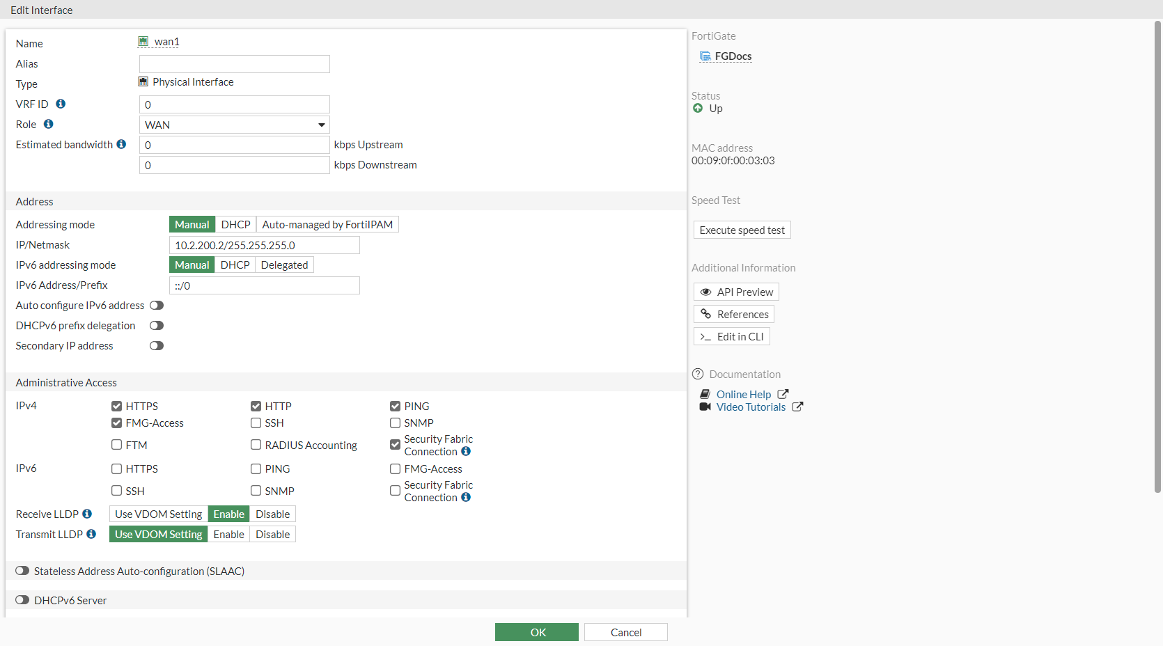 • If the interface's role is WAN, under Administrative Access, set Receive LLDP to Enable and Transmit LLDP to Use VDOM Setting.