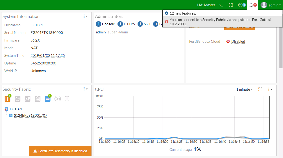 3. Click OK. A notification is shown on FortiGate B, You can connect to a Security Fabric via an upstream FortiGate at 10.2.200.1.