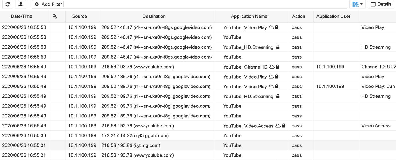 There are logs not only for YouTube, but also for YouTube_Video.Play, YouTube_Video.Access, and so on, as verified from the Application Name column.
