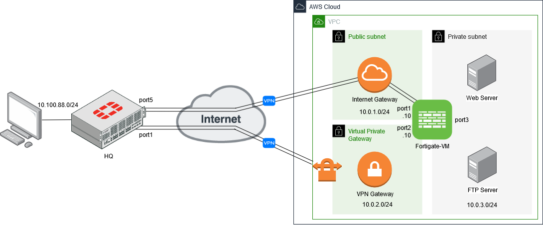 - Configuring the VPN overlay between the HQ FortiGate and AWS native VPN gateway