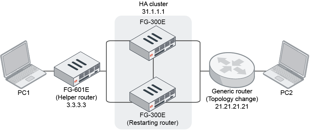In this example, a restarting router (one of the FG-300Es in the HA cluster) informs its neighbors using grace LSAs before restarting its OSPF process. When the helper router (the FG-601E) receives the grace LSAs, it enters helper mode to help with the graceful restart until the graceful period expires. It will act as though there are no changes on the restarting router (FG-300E). A generic router simulates a topology change during the restart event.