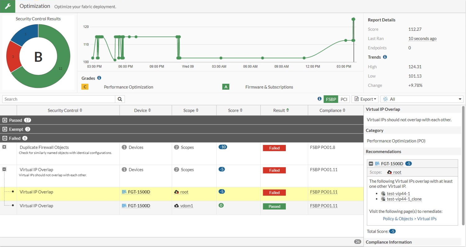 - Go to Security Fabric > Security Rating and click the Optimization scorecard.