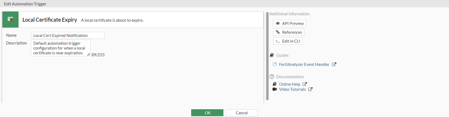 The local certificate expiry trigger (local-certificate-near-expiry) can be used in an automation stitch if a user-supplied local certificate used for SSL VPN, deep inspection, or other purpose is about to expire. This trigger relies on a VPN certificate setting in the CLI configuration setting for the certificate log expiring warning threshold: