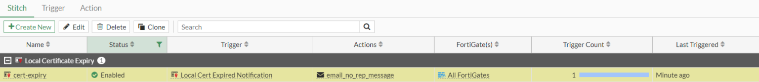 config system automation-stitch edit "cert-expiry" set trigger "Local Cert Expired Notification" config actions edit 1 set action "email_no_rep_message" set required enable next end next end